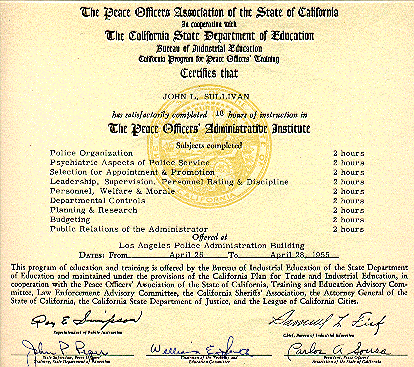 - Life Diplomat of the California State Board of Education for teaching police Science
